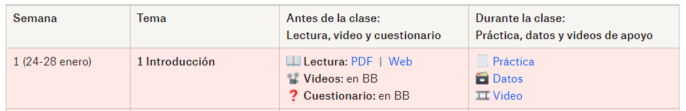 - Antes del primer día de clase de cada semana: 1) Lee el capítulo del libro de texto en Perusall; 2) Contesta el cuestionario en Blackboard.